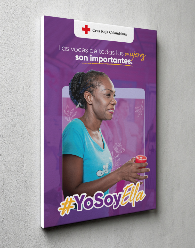 Para la activación presencial, diseñé retablos que vistieron la sede nacional de la Cruz Roja Colombiana, así como tarjetas de invitación para un conversatorio. Uno de estos retablos se dejó en blanco, simulando un marco de historias de Instagram, donde se invitó a los miembros de la institución a tomarse fotos con una de las mujeres más importantes de su vida. Esta misma dinámica se trasladó a redes sociales con una plantilla para historias, motivando a la comunidad digital a sumarse al movimiento. Además, diseñé una serie de piezas gráficas enfocadas en reforzar mensajes de sororidad y respeto, promoviendo la eliminación de la violencia y la reducción de las brechas de género a través de nuestras plataformas digitales.